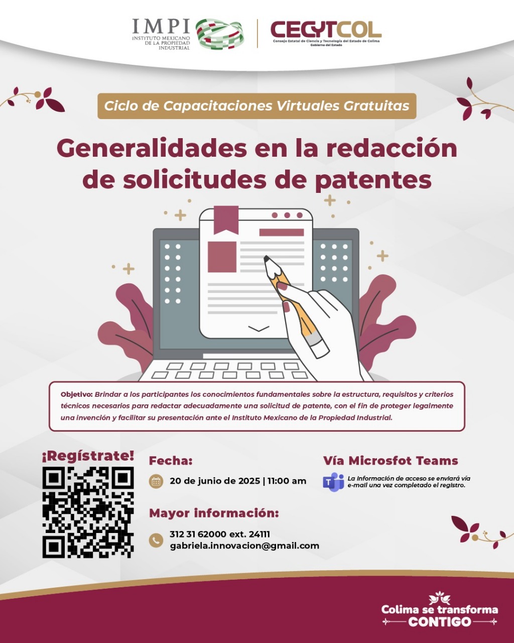 El Gobierno del Estado de Colima, a través del Consejo Estatal de Ciencia y Tecnología (Cecytcol), en coordinación con la Instituto Mexicano de la Propiedad Industrial (IMPI), reitera la invitación a la comunidad colimense a participar en la tercera sesión del ciclo gratuito de capacitaciones virtuales sobre Propiedad Industrial y Emprendimiento, que se efectuará este viernes, a partir de las 11:00 horas.