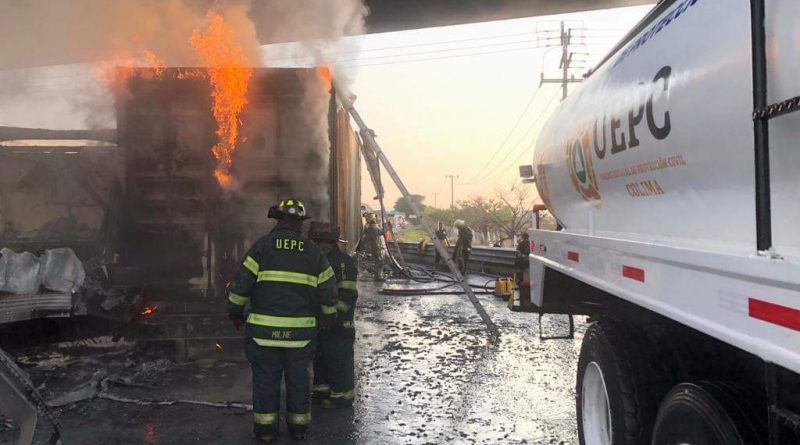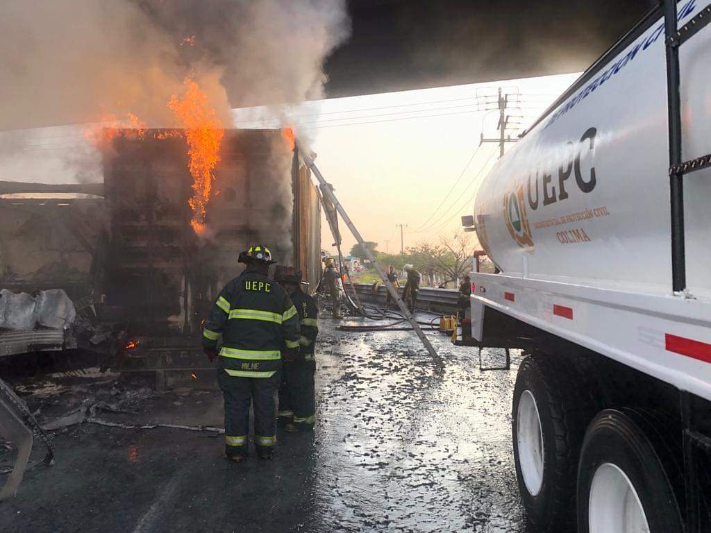 Aproximadamente a las 2:00 am, de este Viernes 23 de Junio, a través del sistema de comunicación entre organismo dedicados a la atención de emergencias, se nos informó, que un camión de transporte de productos lácteos se incendiaba en la autopista Colima – Guadalajara, a la altura del registro Fitozoosanitario, en el municipio de Cuauhtémoc.