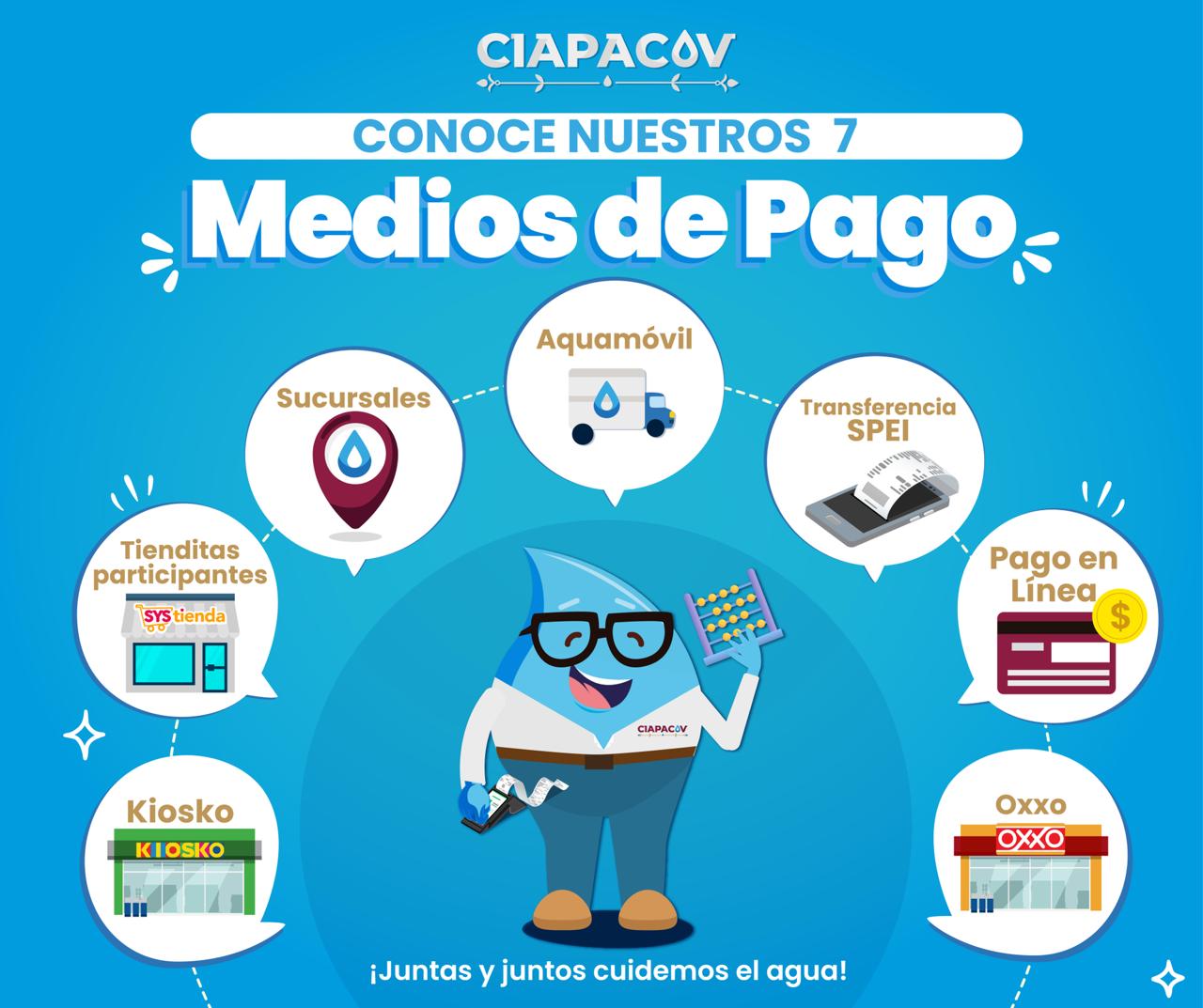 Sí el recibo de agua está al corriente, los usuarios de CIAPACOV también pueden pagar a través del Systienda, sistema que permite el pago en tiendas de abarrotes participantes; en cualquier Oxxo (solo con efectivo); y también en Kiosko (con tarjeta de crédito, débito y en efectivo).