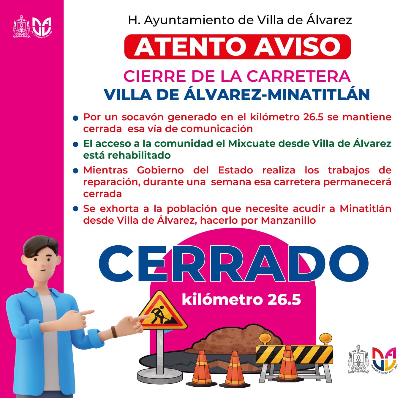 La Unidad Municipal de Protección Civil de Villa de Álvarez y la Dirección de Desarrollo Municipal, informan que el socavón en el kilómetro 26.5 de la carretera Villa de Álvarez-Minatitlán no afecta el acceso a la comunidad de El Mixcuate, por lo que la comunicación con esa localidad desde Villa de Álvarez no está afectada.