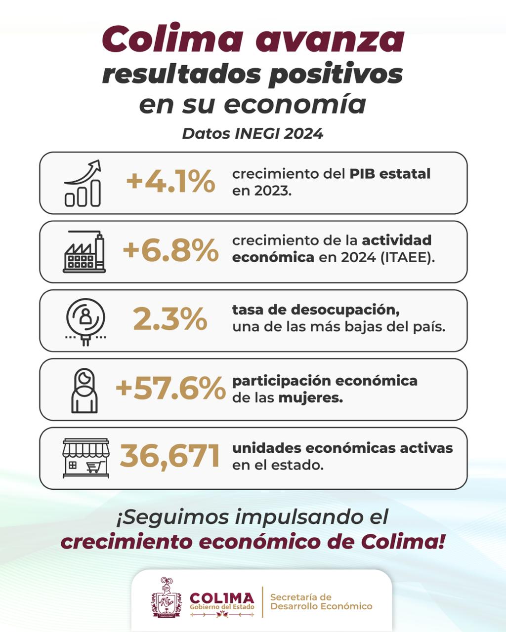 La Secretaría de Desarrollo Económico (Sedeco) del Gobierno del Estado de Colima destaca que, de acuerdo con los datos más recientes del Instituto Nacional de Estadística y Geografía (Inegi), la entidad continúa consolidándose como una de las economías más dinámicas del país.