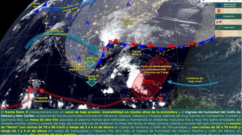 Así mismo, indicó que, durante las próximas horas, dos canales de baja presión (uno sobre el noroeste, occidente, centro y sur de México, y otro sobre el oriente del país), ocasionarán lluvias e intervalos de chubascos en dichas regiones, siendo lluvias puntuales fuertes en Puebla.