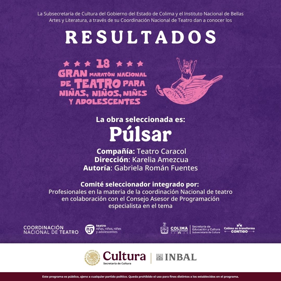La Subsecretaría de Cultura del Gobierno del Estado de Colima, en conjunto con el Instituto Nacional de Bellas Artes y Literatura (INBAL), publicaron los resultados de la convocatoria para integrar la programación del 18° Gran Maratón Nacional de Teatro para Infancias y Juventudes, donde la Compañía de Teatro Caracol resultó seleccionada con su obra ‘Púlsar’ para ser parte de la cartelera que se desarrollará de manera simultánea en distintos estados de la República Mexicana el 21 y 22 de marzo, para celebrar el Día Mundial del Teatro para Infancias y Juventudes.