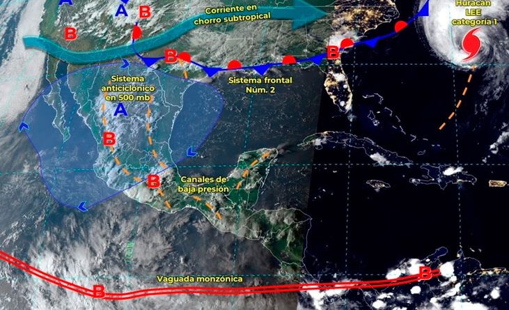 Durante la noche y madrugada de este viernes 15 de septiembre, canales de baja presión sobre el interior y sureste del país, aunados a inestabilidad atmosférica e ingreso de humedad del Océano Pacífico, Mar Caribe y Golfo de México, ocasionarán intervalos de chubascos en Colima, Jalisco, Michoacán, Estado de México, Ciudad de México, Hidalgo, Tabasco, Campeche y Quintana Roo.