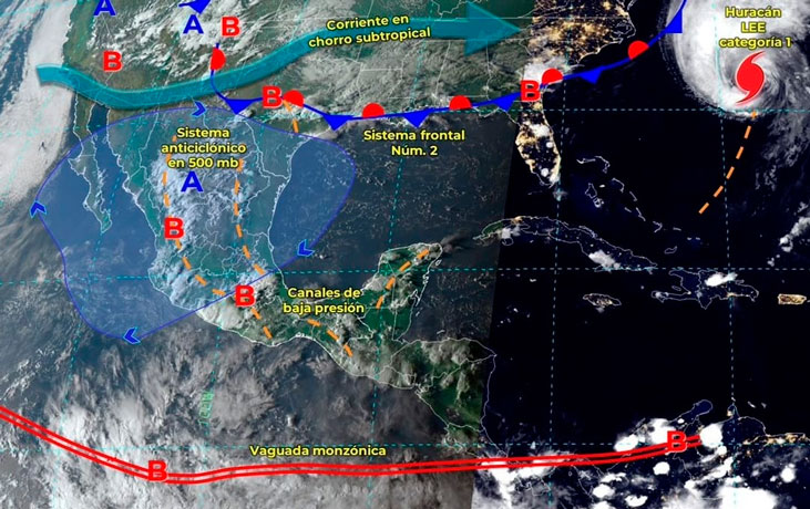 Durante la noche y madrugada de este viernes 15 de septiembre, canales de baja presión sobre el interior y sureste del país, aunados a inestabilidad atmosférica e ingreso de humedad del Océano Pacífico, Mar Caribe y Golfo de México, ocasionarán intervalos de chubascos en Colima, Jalisco, Michoacán, Estado de México, Ciudad de México, Hidalgo, Tabasco, Campeche y Quintana Roo.