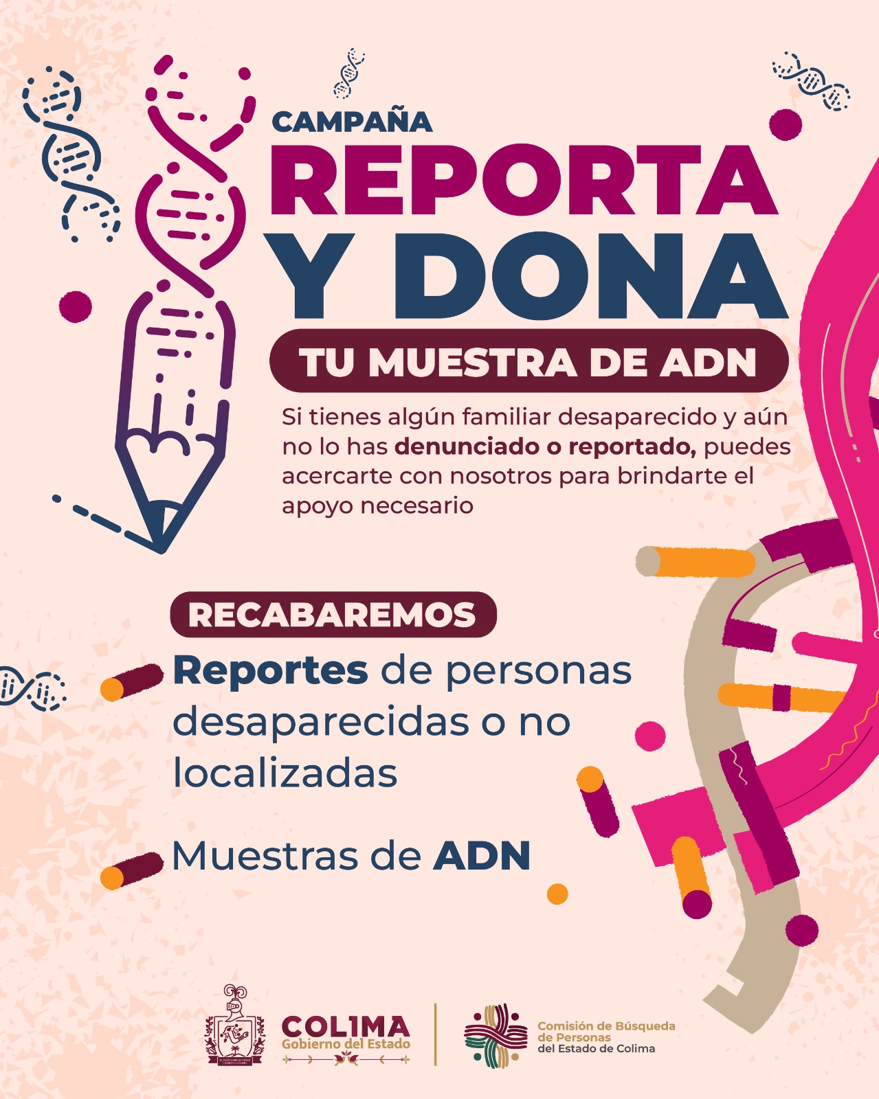 La Comisión de Búsqueda de Personas del Estado de Colima exhorta a todas las personas que tengan un familiar desaparecido o no localizado y aún no hayan presentado reporte o denuncia, a sumarse a la Campaña Reporta y dona tu Muestra Genética, que se realizará del 19 al 27 de mayo, en coordinación interinstitucional con los tres órdenes de gobierno y la participación de colectivos, en la que se busca obtener muestras de ADN de familiares directos de personas desaparecidas para ayudar a identificarlas.