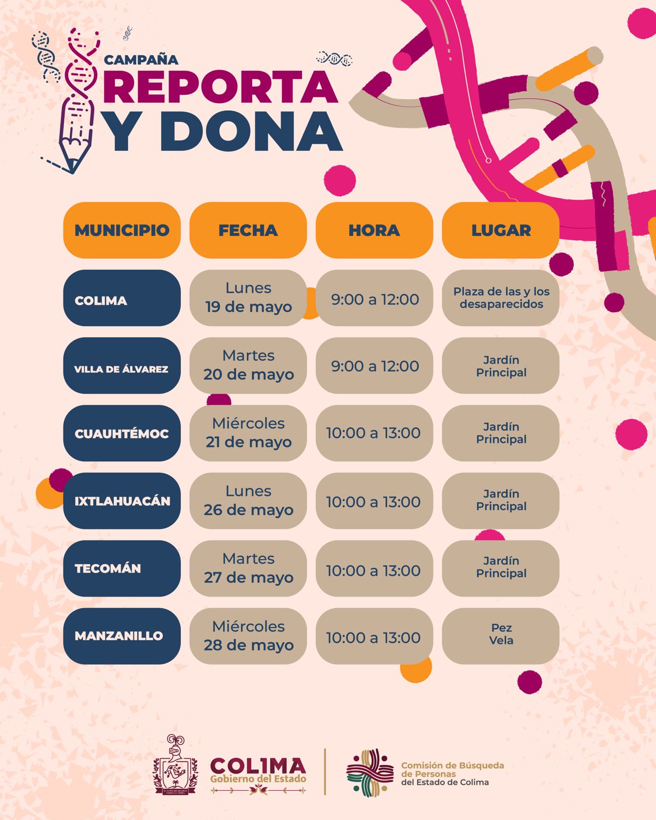 Si eres familiar de una persona desaparecida y aún no donas tú muestra genética, puedes hacerlo en los módulos itinerantes que estarán ubicados en el municipio de Colima el 19 de mayo de 9:00 de la mañana a 12:00 de la tarde en la plaza de las y los desaparecidos en la Piedra Lisa; en Villa de Álvarez el martes 20 de mayo en el mismo horario, en el jardín principal frente a la Presidencia Municipal.