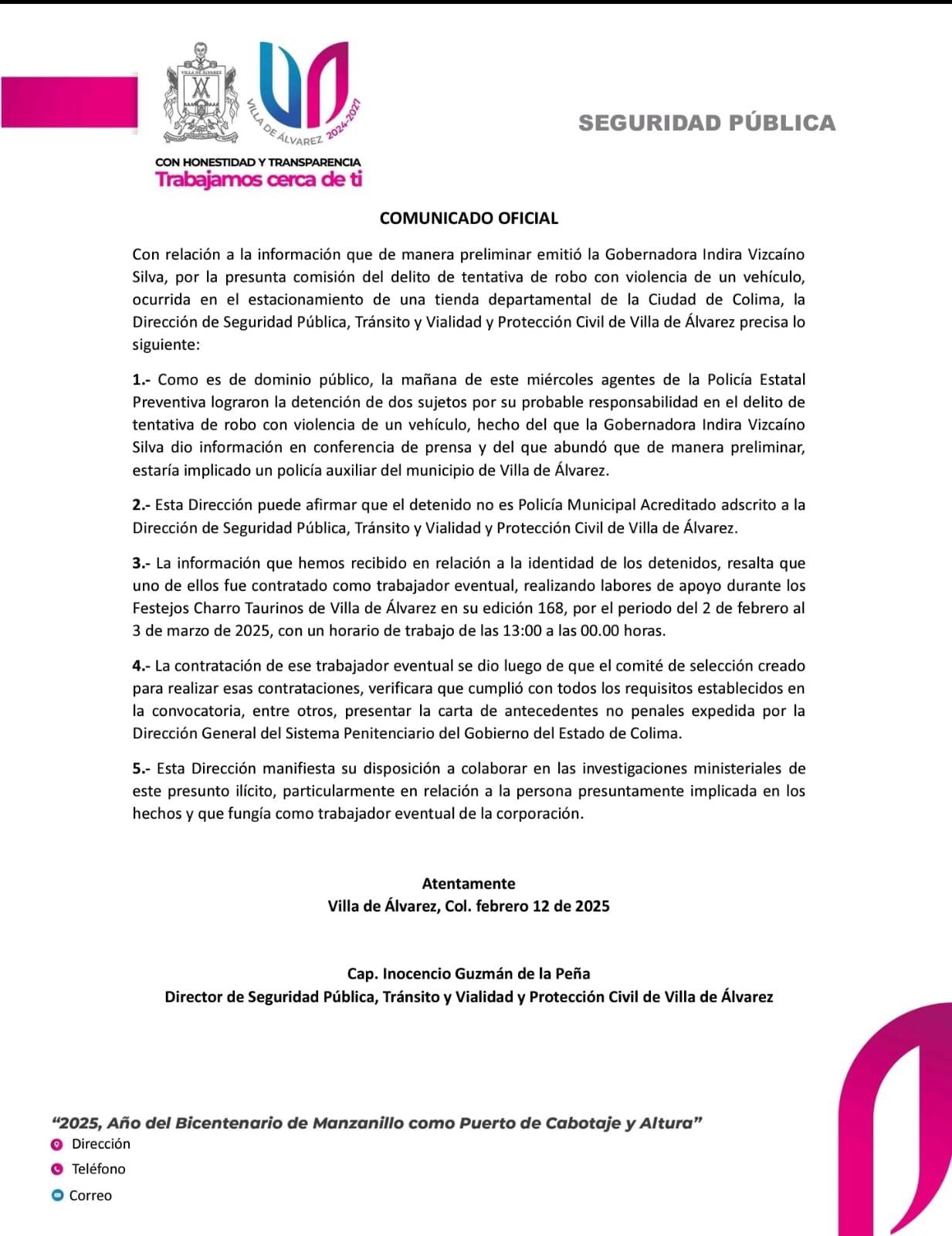 3.- La información que hemos recibido en relación a la identidad de los detenidos, resalta que uno de ellos fue contratado como trabajador eventual, realizando labores de apoyo durante los Festejos Charro Taurinos de Villa de Álvarez en su edición 168, por el periodo del 2 de febrero al 3 de marzo de 2025, con un horario de trabajo de las 13:00 a las 00.00 horas.