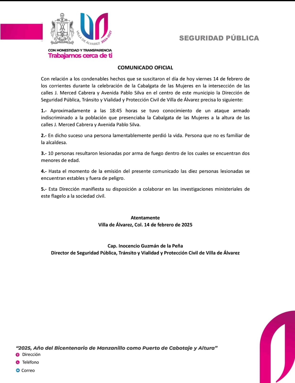 1.- Aproximadamente a las18:45 horas se tuvo conocimiento de un ataque armado indiscriminado a la población que presenciaba la Cabalgata de las Mujeres a la altura de las calles J. Merced Cabrera y Avenida Pablo Silva.