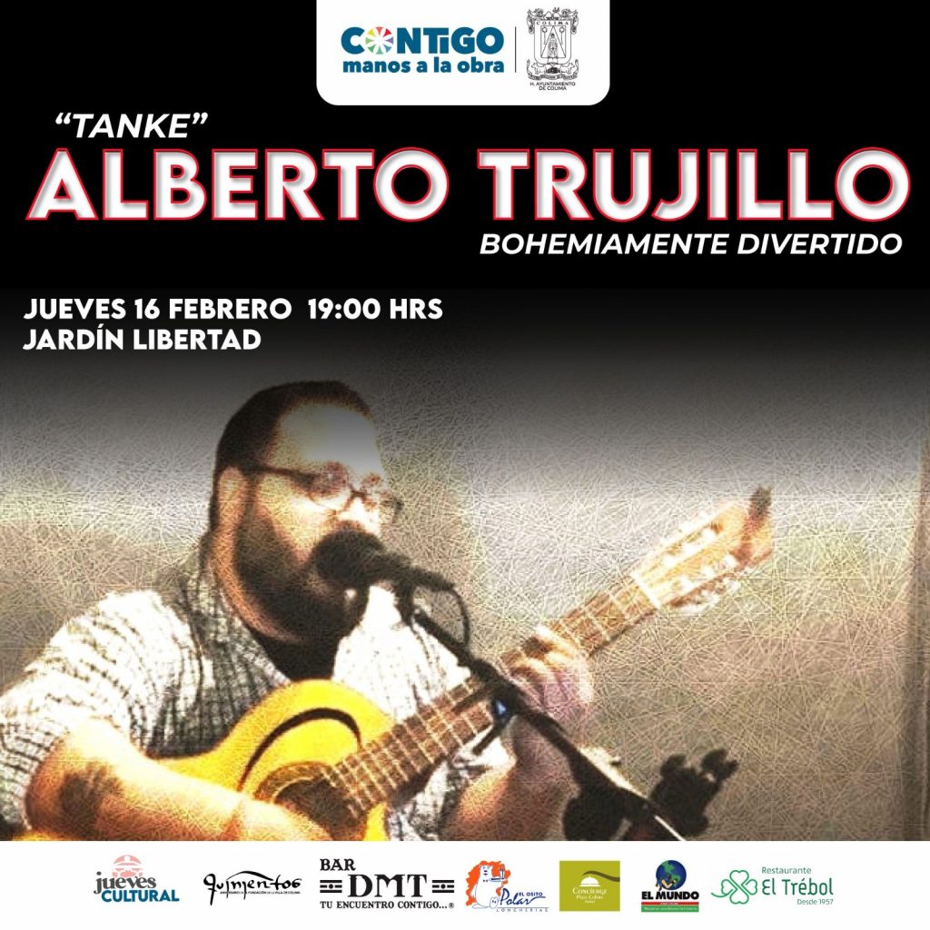 La agenda cultural inicia con el concierto ‘Bohemiamente divertido’ con el cantautor colimense Alberto Trujillo “El Tanke” quien, en el marco del Jueves Cultural, este 16 de febrero se presentará para el público colimense en el Jardín Libertad, a partir de las 07:00 de la tarde.