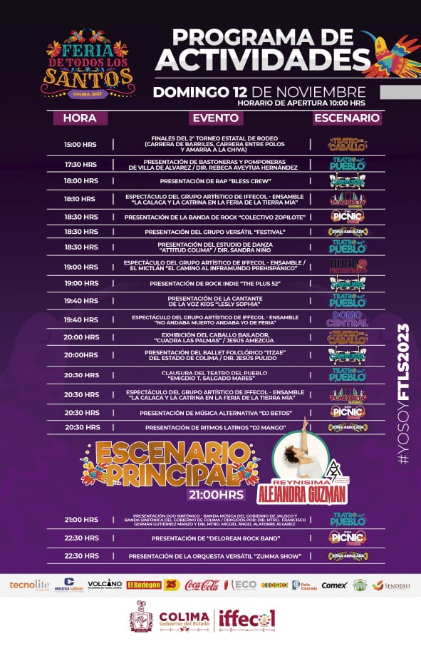 Todo esto dentro de la amplia gama de atractivos que se ofrecen en el último día de la Feria de Colima, en los diferentes escenarios, como el recinto ferial, el domo principal, el Teatro del Pueblo, el Mundo Prehispánico y las tres zonas (arbolada, picnic y carrusel), con diversas presentaciones y espectáculos gratuitos y familiares.