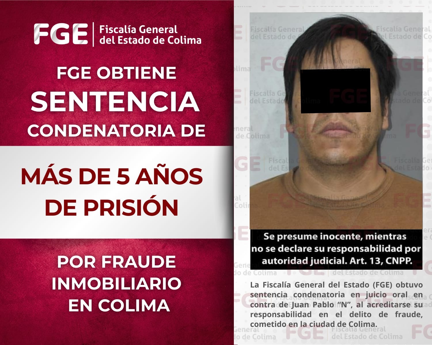La Fiscalía General del Estado (FGE) obtuvo sentencia condenatoria en juicio oral en contra de Juan Pablo “N”, al acreditarse su responsabilidad en el delito de fraude, cometido en la ciudad de Colima.