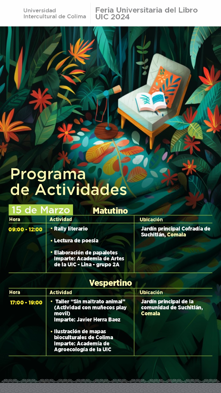 Para este 15 de marzo, las actividades literarias y culturales de la Feria Universitaria del Libro serán de las 9:00 de la mañana a las 12:00 de la tarde, en los jardines principales de dos comunidades rurales de Comala, como son Suchitlán y Cofradía de Suchitlán.