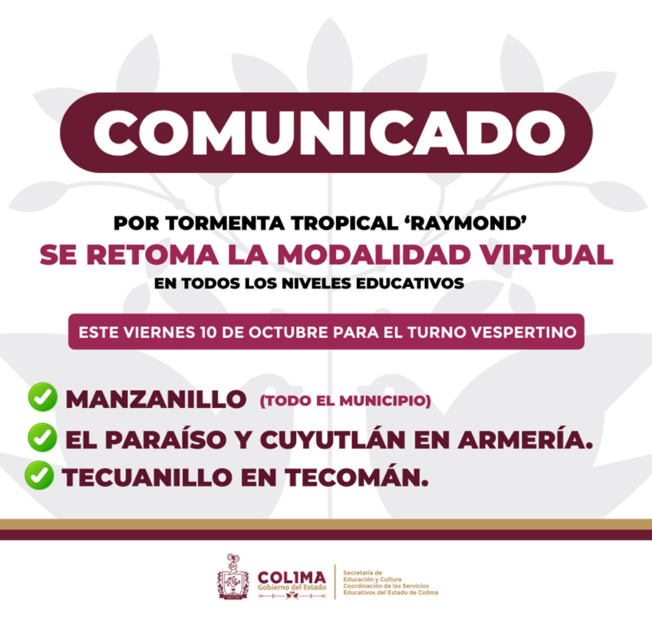 La Secretaría de Educación y Cultura del Gobierno del Estado de Colima informa que ante las condiciones climáticas que prevalecen en la entidad, derivadas de la Tormenta Tropical ‘Raymond’, y en atención a la recomendación del Comité Científico Asesor Técnico de Protección Civil, se ha determinado la suspensión de las clases presenciales en el turno vespertino para la comunidad educativa, hoy viernes 10 de octubre.