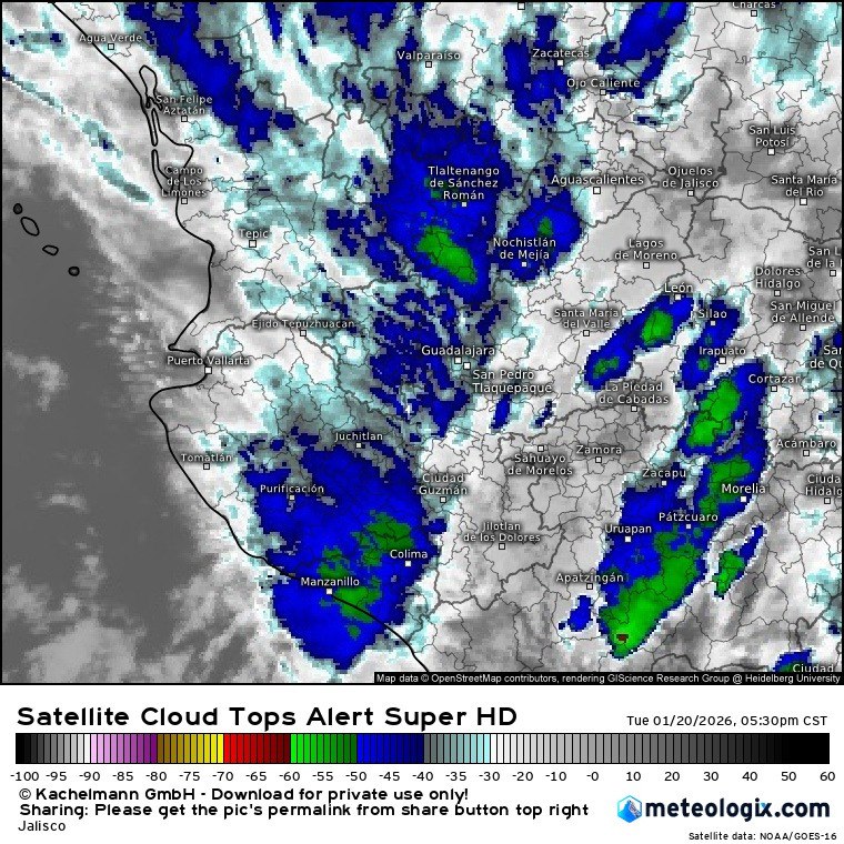 Debido al ingreso de humedad proveniente del Océano Pacifico y a las condiciones meteorológicas en el Volcán Nevado de Colima, se registra precipitación combinada de lluvia, nieve y/o aguanieve con rachas de viento de 40 km/h y eventuales superiores. Así mismo se mantiene generalizado el potencial de lluvias en todo el Estado, siendo probables intervalos de chubascos que podrían mantenerse intermitentes el resto del día.