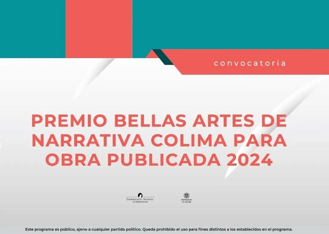 La Secretaría de Cultura federal y el Instituto Nacional de Bellas Artes y Literatura (Inbal), a través de la Coordinación Nacional de Literatura (CNL), y la Universidad de Colima, convocan al Premio Bellas Artes de Narrativa Colima para Obra Publicada 2024.