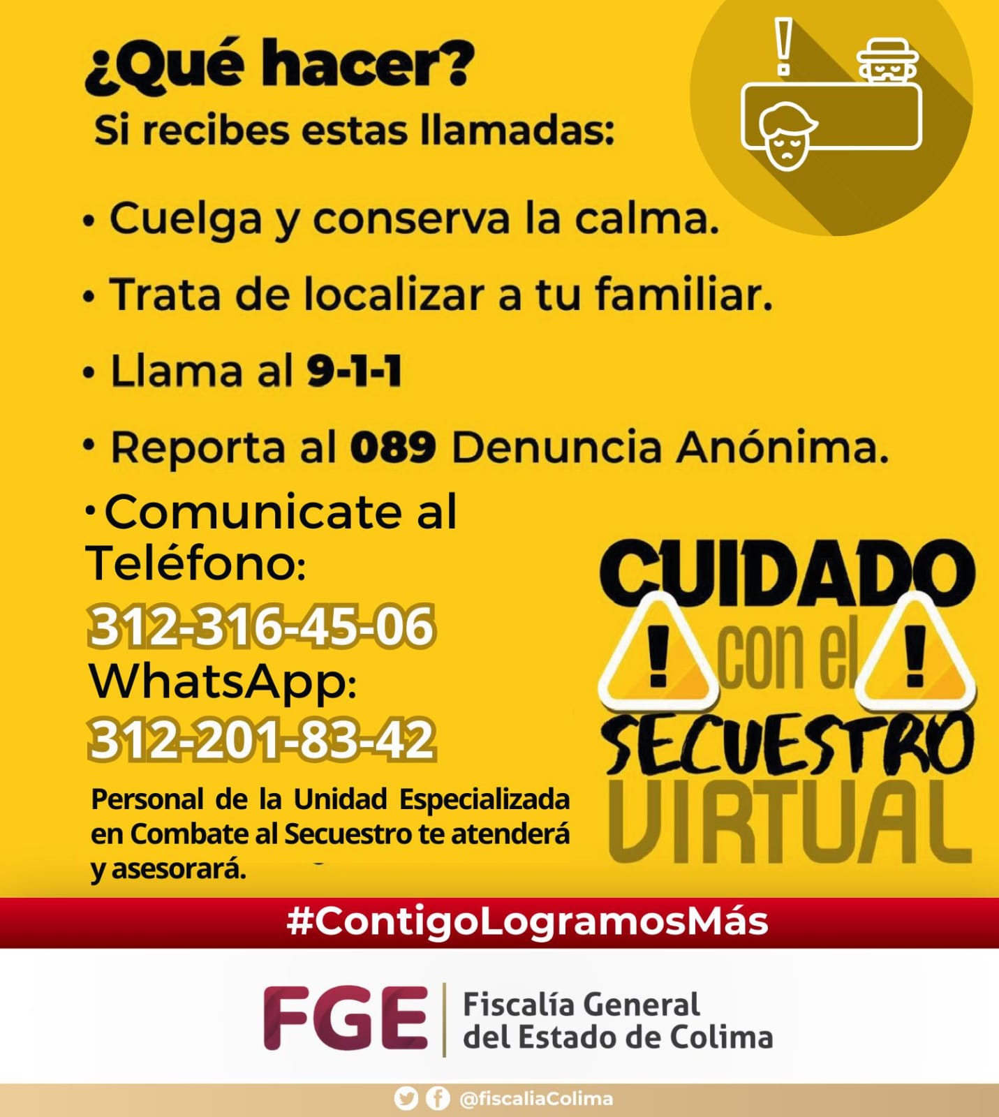 La Fiscalía exhorta a la población a estar alerta ante este tipo de llamadas de extorsión, y a que cuelgue a números telefónicos de personas que no conoce.