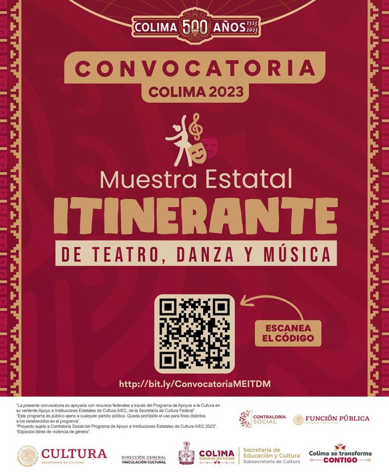 El Gobierno del Estado de Colima, a través de la Subsecretaría de Cultura, abrió la nueva convocatoria para la Muestra Estatal Itinerante de Teatro, Danza y Música 2023, con la que artistas colimenses podrán participar, con el propósito de ser seleccionadas y seleccionados para llevar sus obras a distintas comunidades rurales de los diez municipios de la entidad.