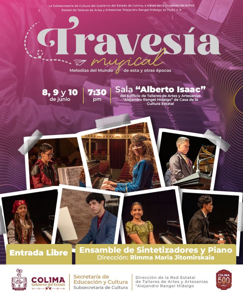 La Subsecretaría de Cultura del Gobierno del Estado de Colima a través de la Dirección de la Red Estatal de Talleres y Artesanías, invitan a la población colimense al concierto gratuito “Travesía Musical, melodías del mundo de esta y otras épocas” este jueves 8, viernes 9 y sábado 10 de junio, en la Sala Alberto Isaac Ahumada en el Edificio de Talleres de Artes y Artesanías “Alejandro Rangel Hidalgo” de la Casa de la Cultura Estatal.