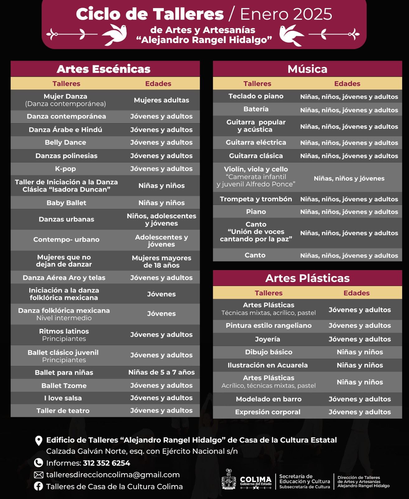 La Subsecretaría de Cultura del Gobierno del Estado de Colima, a través de la Dirección de Talleres de Artes y Artesanías ‘Alejandro Rangel Hidalgo’, ha presentado una oferta de 38 talleres de las áreas de artes escénicas, música y artes plásticas, mismos que se desarrollarán de enero a junio del presente año, en los que podrán integrarse niñas, niños, adolescentes, jóvenes y personas adultas.
