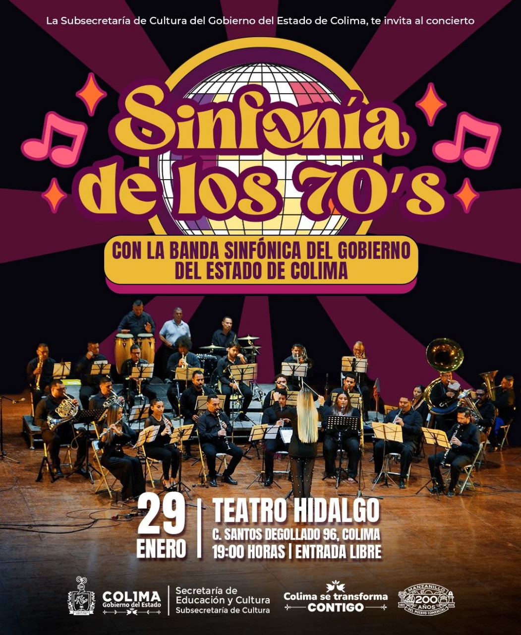Se trata del concierto titulado ‘Sinfonía de los 70’s’, a cargo de la Banda Sinfónica del Gobierno del Estado de Colima.