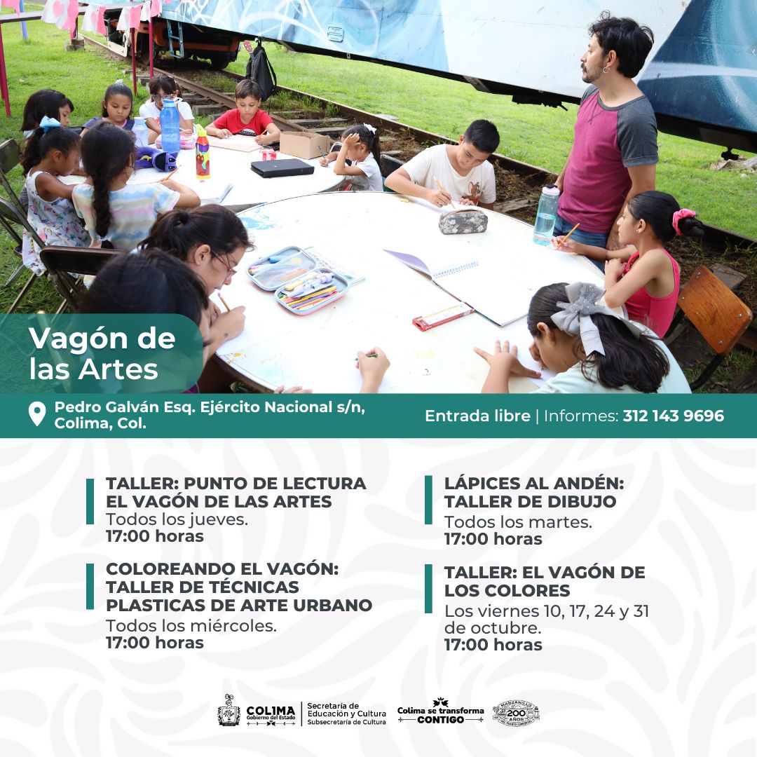 La agenda cultural mensual también ofrece una variada oferta de talleres gratuitos de lunes a sábado en diferentes espacios públicos de la dependencia estatal de Cultura, entre ellos el Centro Cultural ‘Julia Piza Miranda’ de Manzanillo; el Vagón de las Artes y La Quininita, espacios para las infancias ubicados en Casa de la Cultura Estatal; el Centro Cultural ‘Balbino Dávalos’, la Biblioteca Pública Central Estatal ‘Profesora Rafaela Suárez’ y el Poliforum Cultural Adolfo Mexiac en el jardín Corregidora de la capital colimense.
