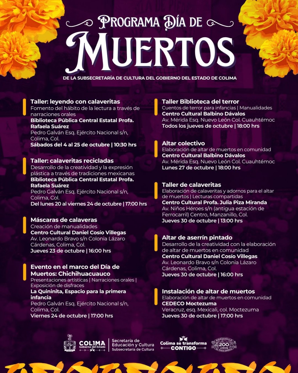 La Subsecretaría de Cultura del Gobierno del Estado de Colima ha preparado una programación especial de eventos artísticos y culturales con motivo del Día de Muertos, cartelera que ofrece actividades gratuitas para públicos diversos, entre talleres gratuitos, eventos comunitarios, creación de altares, narraciones orales y exposición de disfraces.