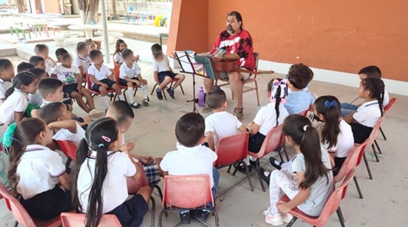 Más de un centenar de alumnas y alumnos, junto al personal docente de cuatro planteles educativos, han disfrutado de divertidas canciones, cuentos y leyendas tradicionales de Colima, en voz de Gabriel Martínez Campos “El Gabo”, enlace del Programa Nacional de Salas de Lectura en esta entidad, en coordinación con la Supervisión de Escuelas de Preescolar de la Secretaría de Educación y Cultura.