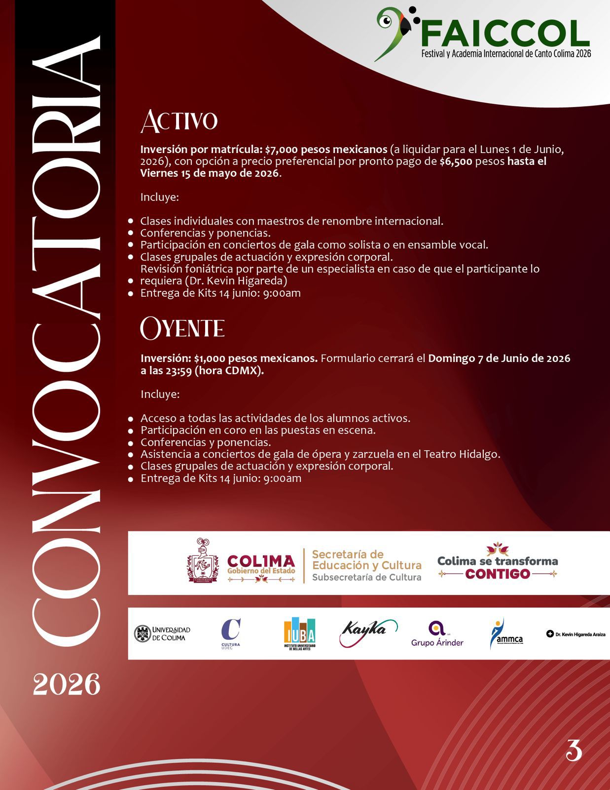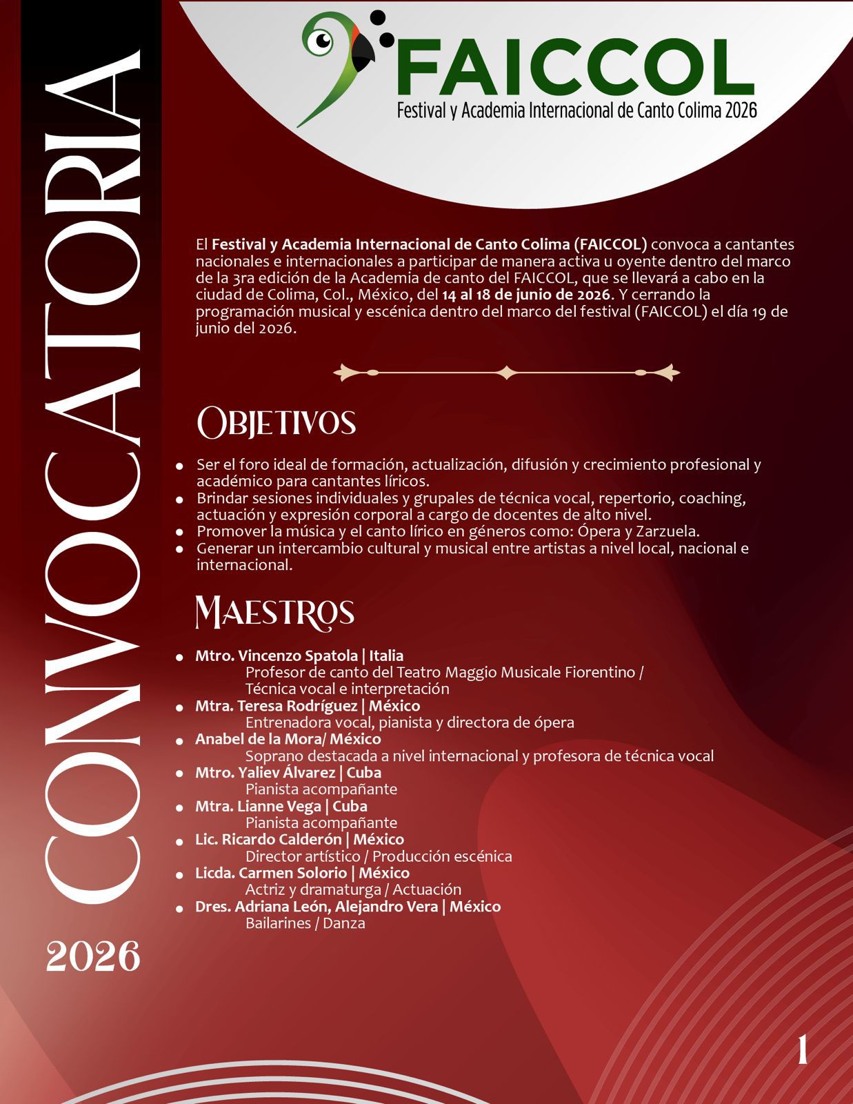 El Gobierno del Estado de Colima que encabeza la mandataria Indira Vizcaíno Silva, a través de la Subsecretaría de Cultura, en coordinación con la Universidad de Colima, publican la convocatoria para formar parte de la tercera edición del Festival y Academia Internacional de Canto Colima (FAICCOL) 2026 que ofrecerá clases magistrales para cantantes profesionales y en formación del 14 al 18 de junio, impartidas por artistas escénicos de reconocida trayectoria, provenientes de Italia, Cuba y distintos estados de la República Mexicana.
