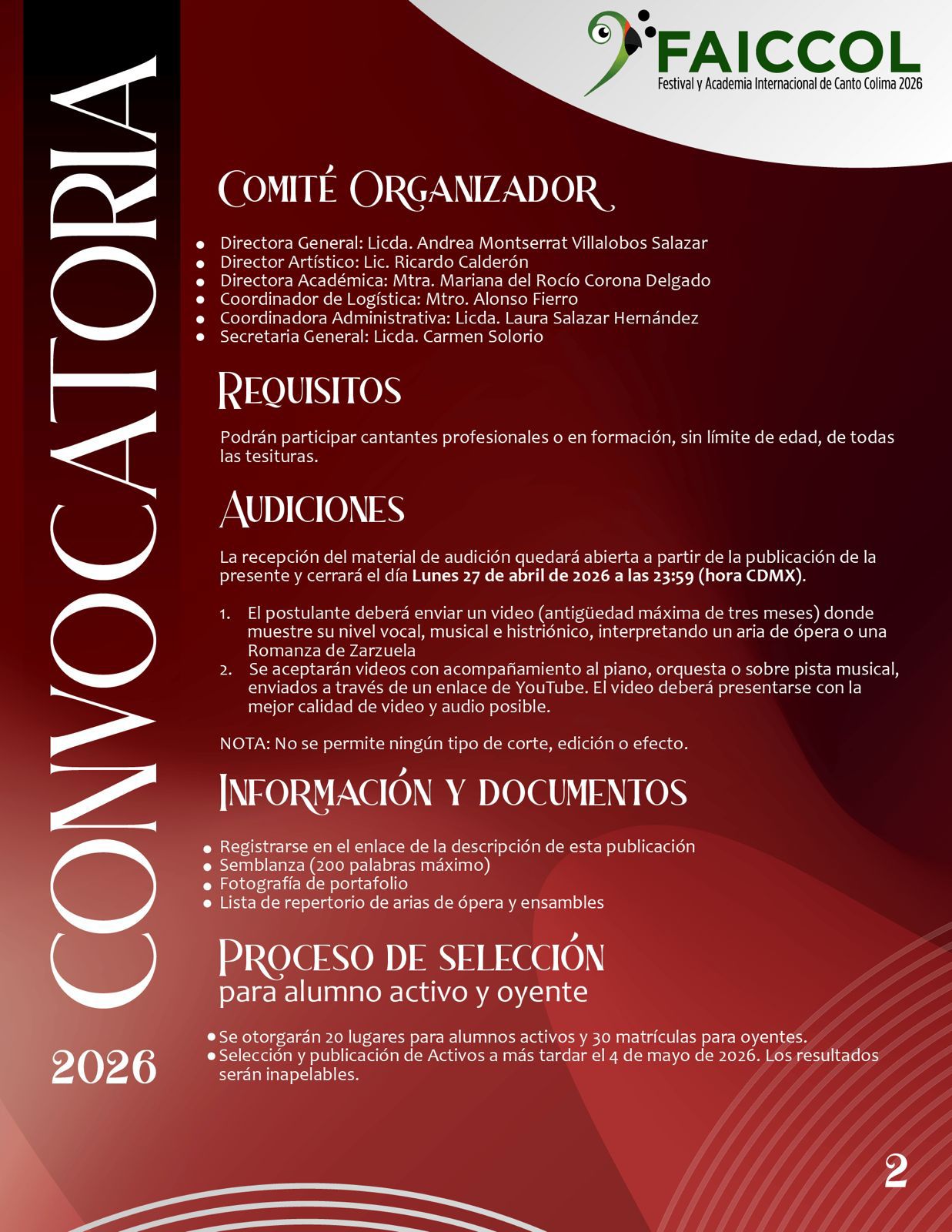 Los requisitos para registro, las bases completas de la convocatoria, así como la plantilla docente, está en las redes oficiales de la Subsecretaría de Cultura y del Comité Organizador del FAICCOL. La fecha límite de envío de audiciones para participantes activos es el 27 de abril, mientras que las personas interesadas en integrarse como oyentes tienen hasta el 7 de junio para llenar el formulario.