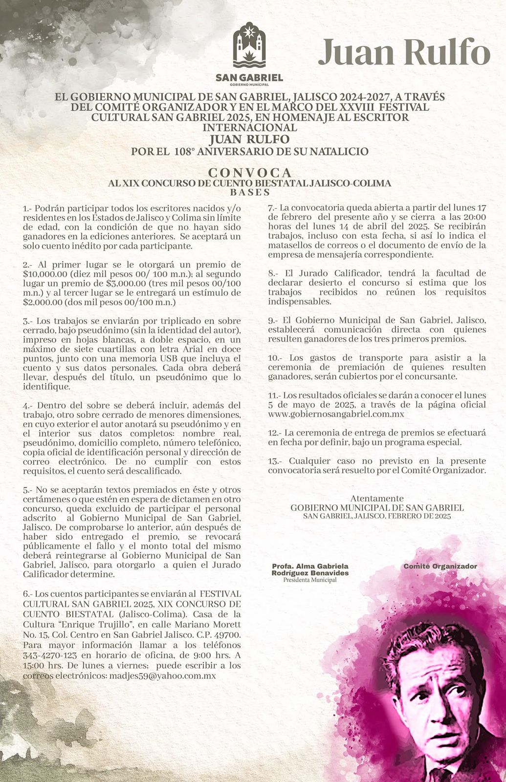 La Subsecretaría de Cultura del Gobierno del Estado de Colima, en coordinación con el Ayuntamiento de San Gabriel Jalisco, convocan a todas y todos los escritores nacidos y radicados en los estados de Colima y Jalisco, a participar en el XIX Concurso de Cuento Biestatal que se realiza en homenaje al prestigiado escritor Juan Rulfo, autor de las novelas ‘Pedro Páramo’ y ‘El llano en llamas’.