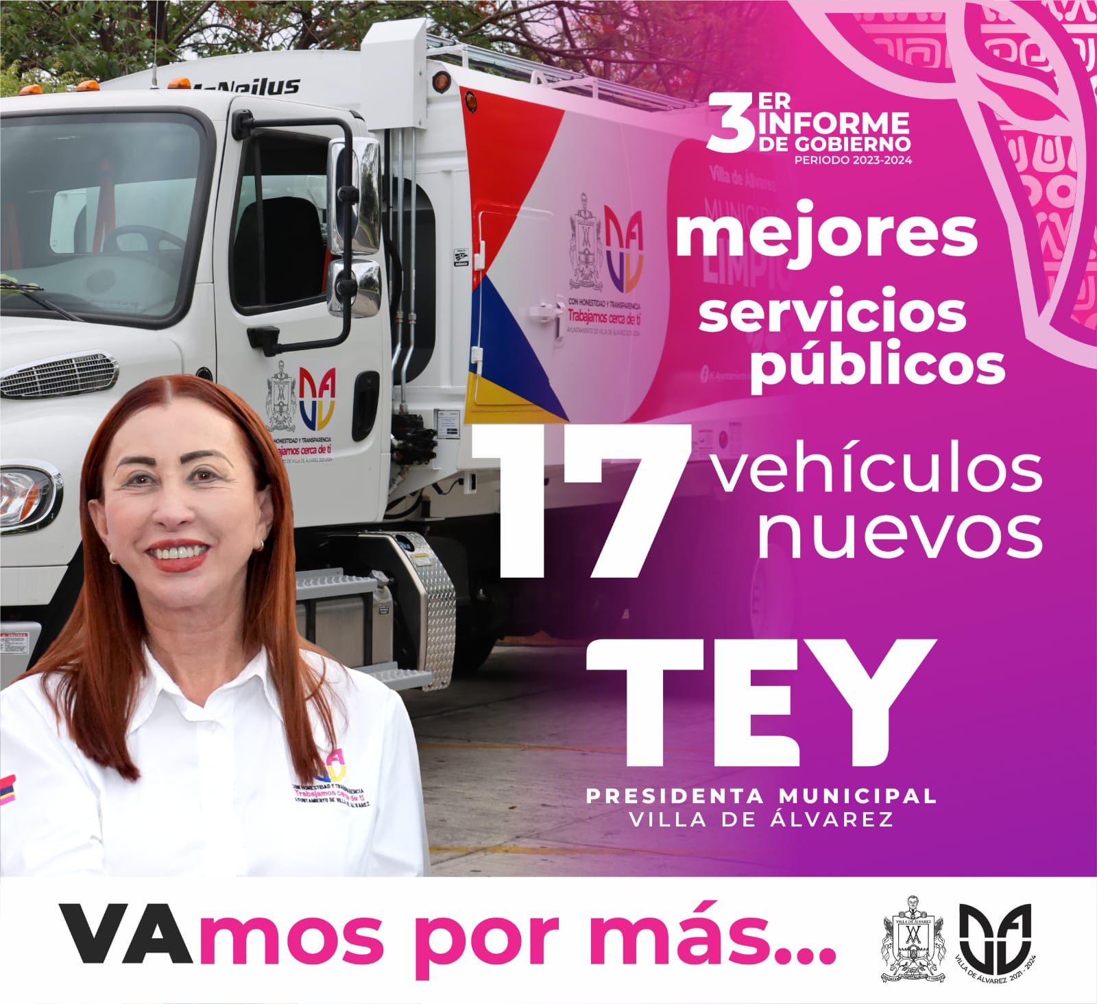 Villa de Álvarez, Col.- De tres camiones recolectores de basura en mal estado, Villa de Álvarez en tres años pasó a tener 17 nuevos vehículos para la recolección de residuos sólidos, mantener en buen estado parques y jardines y realizar acciones de descacharrización, señaló la Alcaldesa Tey Gutiérrez Andrade.