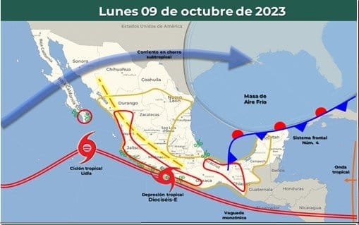 Respecto a las temperaturas máximas, la Conagua prevé que para este lunes 9 de octubre el estado de Colima podría alcanzar hasta 35 grados Celsius, al igual que en Jalisco, Michoacán, Guerrero, Sinaloa, Nayarit, Tamaulipas, San Luis Potosí, Veracruz y Tabasco.