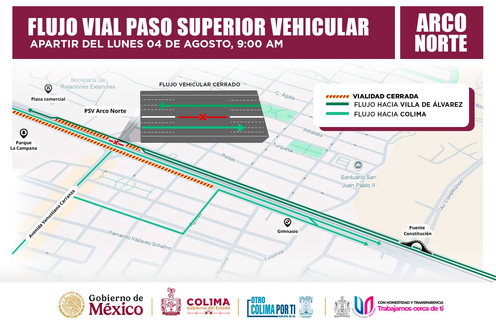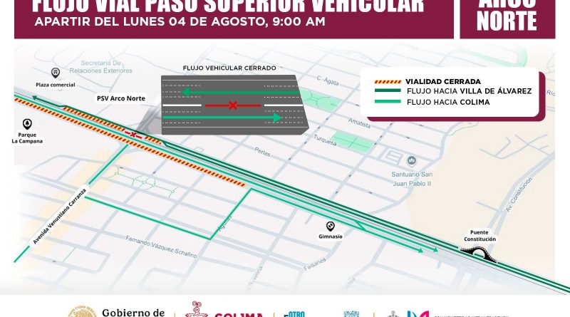 Como parte de los trabajos para la construcción del Paso Superior Vehicular Arco Norte, este lunes 4 de agosto, a partir de las 9:00 de la mañana, se inhabilitará el cruce de la avenida V. Carranza, en ambos sentidos (norte-sur y sur-norte), quedando el flujo libre por los carriles centrales Colima-Villa de Álvarez y viceversa, informa el Gobierno del Estado de Colima.