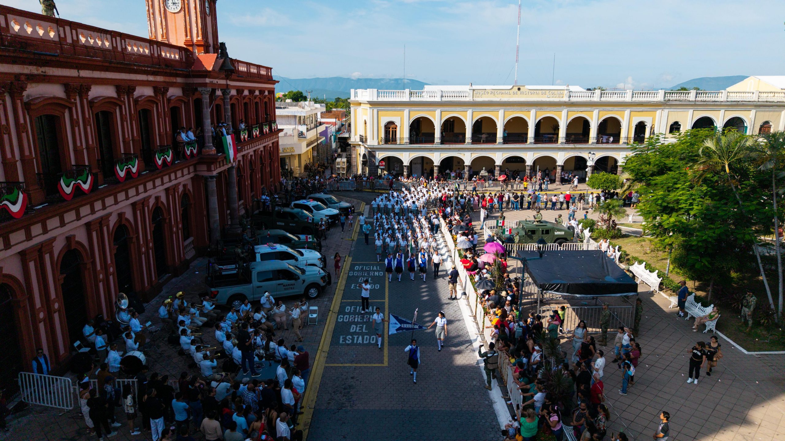La gobernadora Indira Vizcaíno Silva y autoridades civiles, militares y navales y de los Poderes Legislativo y Judicial, atestiguaron desde el balcón principal de Palacio de Gobierno el paso de los contingentes que recorrieron las calles José María Morelos, Independencia, Santos Degollado, 16 de Septiembre, Reforma y Francisco I. Madero, finalizando en el cruce entre Madero y Juárez.