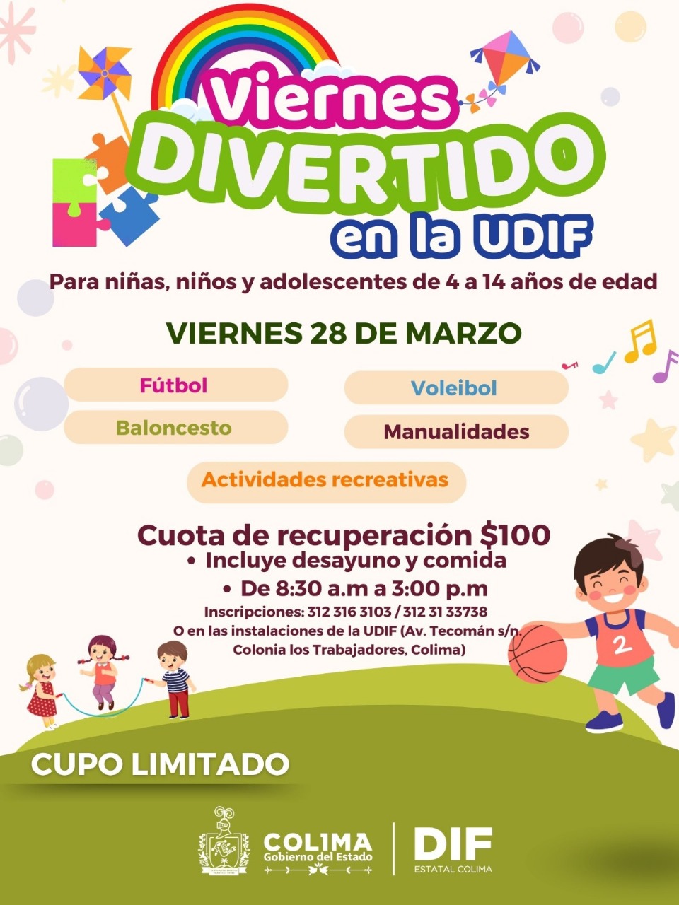 Con el objetivo de brindar espacios seguros y recreativos para niñas, niños y adolescentes, el Gobierno del Estado de Colima, a través del DIF Estatal, invita al ‘Viernes Divertido en la UDIF’, que se llevará a cabo el próximo 28 de marzo, de 8:30 de la mañana a 3:00 de la tarde, como parte de este programa que promueve el derecho al sano esparcimiento y la recreación.
