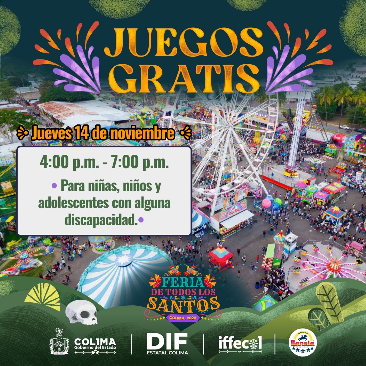 El DIF Estatal Colima anuncia que este jueves 14 de noviembre se ofrecerán juegos gratuitos a niñas, niños y adolescentes con alguna discapacidad, menores de grupos vulnerables o de comunidades alejadas, que previo a esta jornada de diversión sin costo alguno, tengan una pulsera entregada por la institución; esto en el marco de las actividades realizadas en conjunto con el Instituto de Fomento de Ferias y Exposiciones del Estado de Colima (Iffecol).