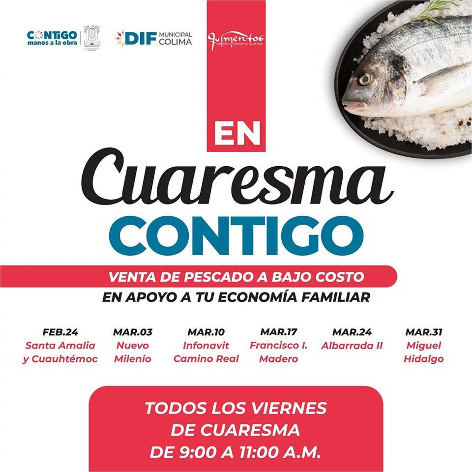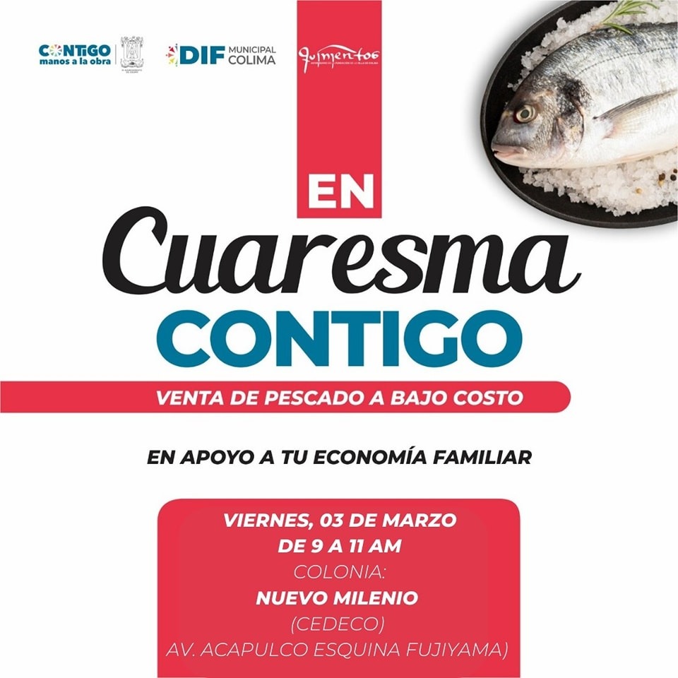 Durante la cuaresma, todos los viernes estaremos en nuestras instalaciones del DIF Municipal Colima, de 09:00 a 11:00 de la mañana así como, en esta ocasión, viernes 03 de marzo, en el CEDECO de la colonia Nuevo Milenio ubicado sobre la Av. Acapulco y calle Fujiyama.