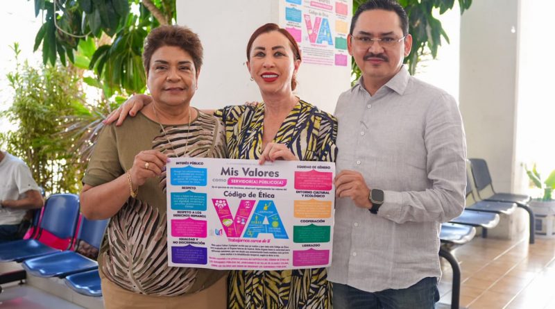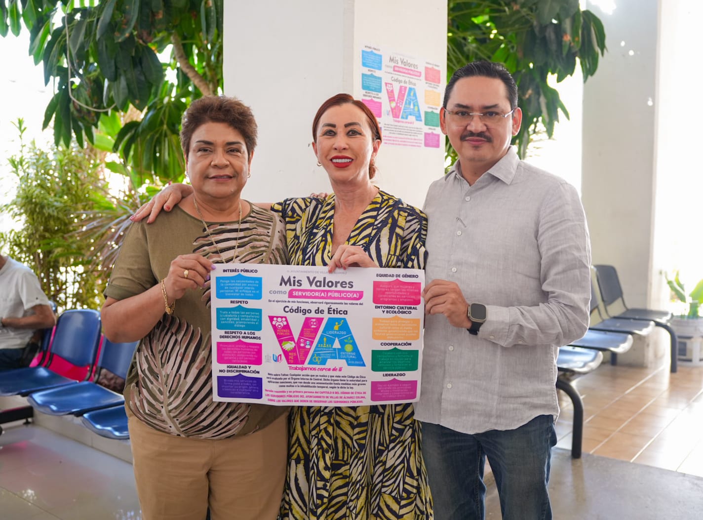 Villa de Álvarez, Col.- Acompañada por el y la dirgente de los dos sindicatos de trabajadores municipales, la Presidenta Tey Gutiérrez Andrade inició la campaña Mis Valores como Servidor Público, la cual difunde, sensibiliza y capacita a la plantilla laboral sobre el Código de Ética de las y los Servidores Públicos del Ayuntamiento de Villa de Álvarez.