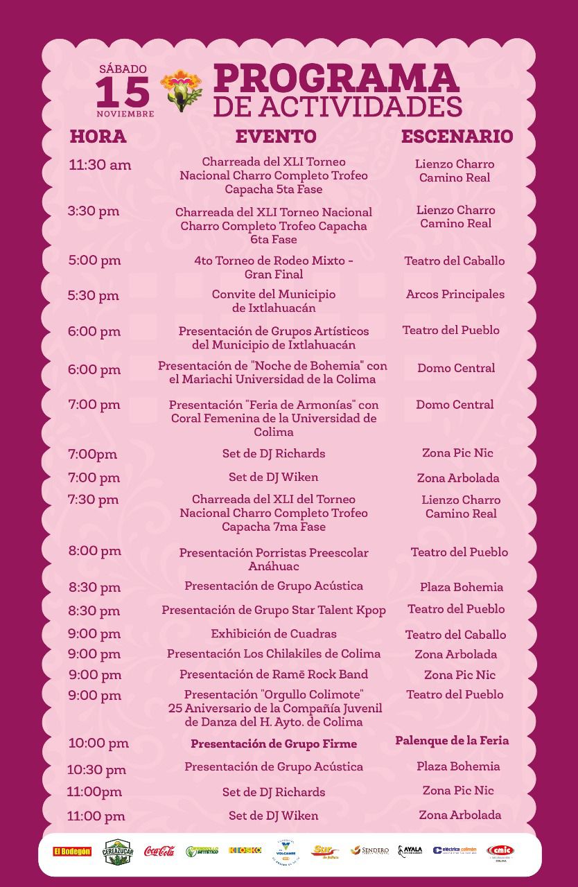 Rodolfo Aguilar Dávalos, director general del Instituto de Fomento de Ferias y Exposiciones (Iffecol) del Gobierno del Estado de Colima, dio a conocer que las actividades inician a las 11:30 de la mañana en el Lienzo Charro Camino Real, con la jornada sabatina del XLI Torneo Nacional Charro Completo ‘Trofeo Capacha’ (quinta fase).