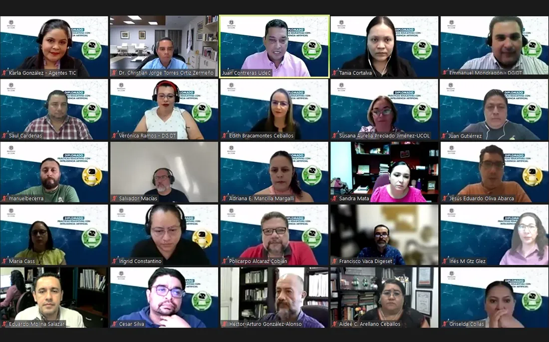 En ceremonia virtual, la Universidad de Colima (UdeC) clausuró el exitoso Diplomado Agentes TIC: prácticas educativas con inteligencia artificial, en el que participaron 221 académicos y personal de apoyo, 169 de esta Casa de Estudios y 52 de otras instituciones como la Universidad Juárez del Estado de Durango, la Universidad Autónoma de Nuevo León, la Autónoma del Estado de México, la Nacional Autónoma de México y la de Guadalajara.