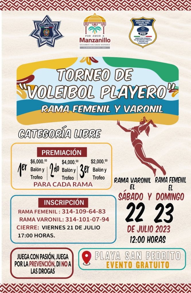 Para seguir generando comunidad y fomentar la activación física, el Ayuntamiento de Manzanillo, a través de la dirección general de Seguridad Pública y Policía Vial, organiza para este sábado y domingo, 22 y 23 de julio respectivamente, el Torneo de Voleibol Playero en San Pedrito, para las ramas femenil y varonil.
