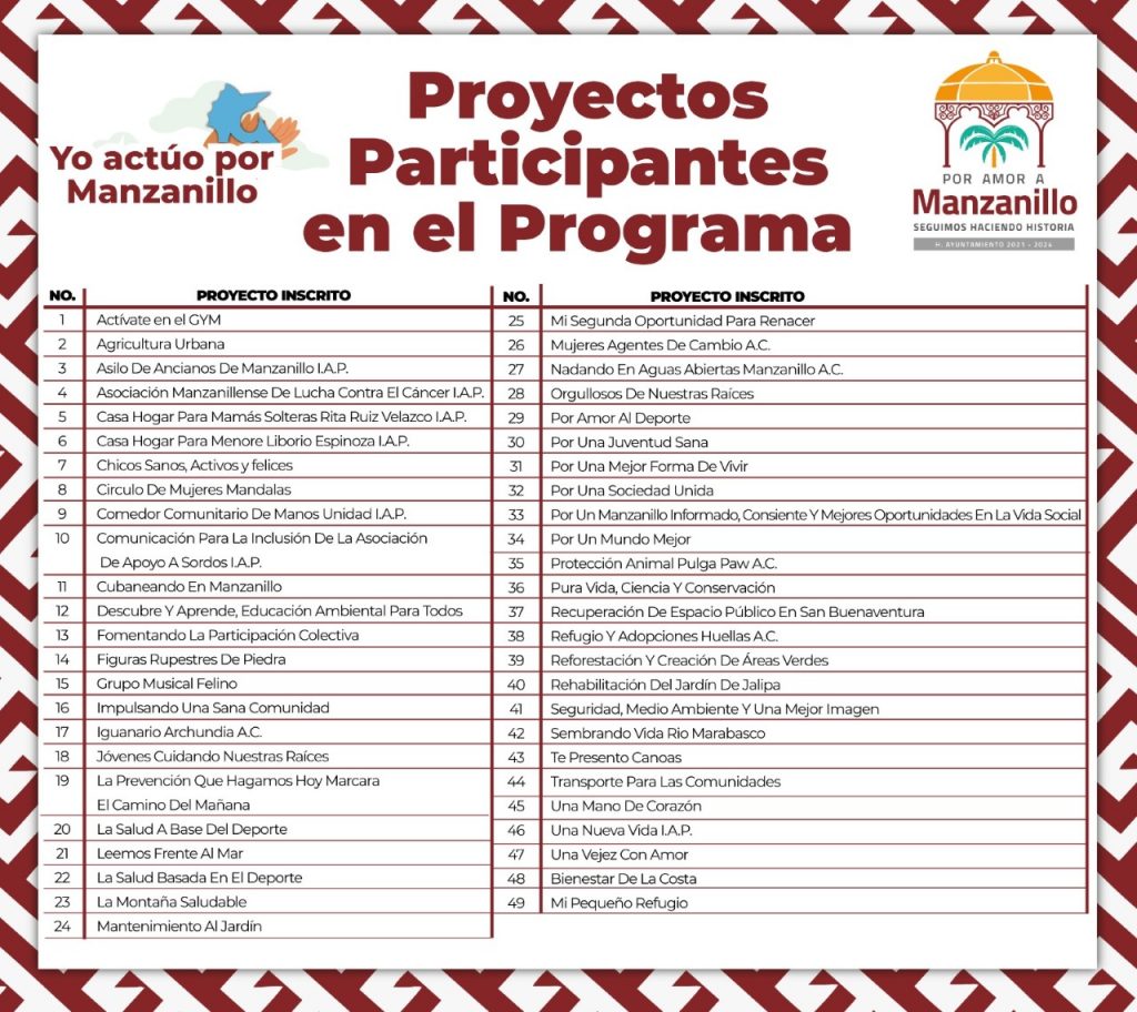 En febrero, el Ayuntamiento de Manzanillo abrió la convocatoria de “Yo actúo por Manzanillo”, la cual cerró el pasado 31 de marzo, la cual estuvo dirigida a organismos, agrupaciones, instituciones y colectivos que tienen proyectos a favor de la comunidad y del entorno. Ésta cerró con la recepción de 49 proyectos; los ganadores serán apoyados de manera económica, pues tal convocatoria tiene 1 millón 280 mil pesos para esa finalidad.