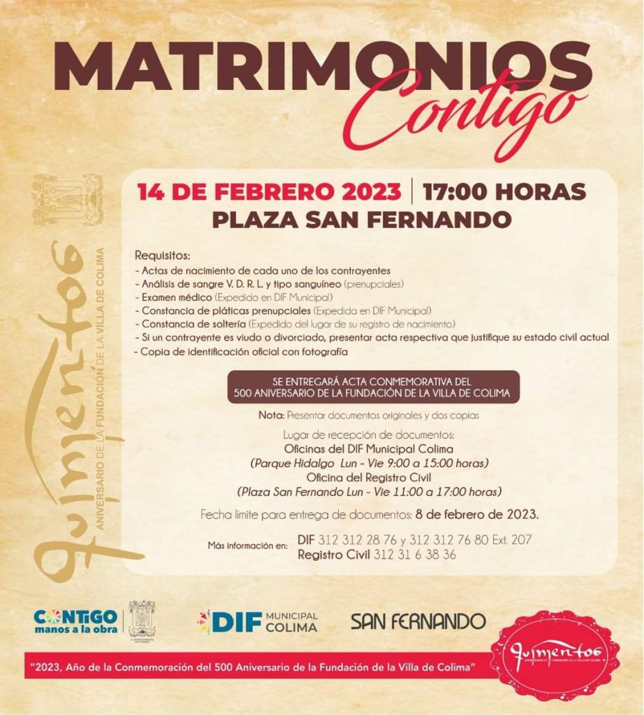 El Ayuntamiento de Colima reitera la invitación para que las parejas interesadas puedan  participar en el programa “Matrimonios Contigo” que, de manera coordinada, implementan el DIF Municipal Colima y la Oficialía del Registro Civil, con el objetivo de regularizar el estado civil de las parejas, con trámites y asesoría sin costo.