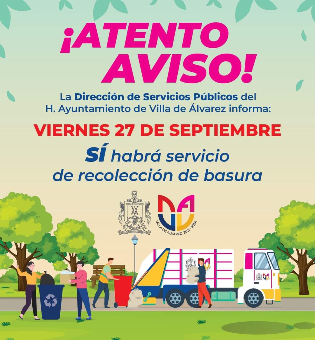 El servicio de recolección de basura se prestará de manera normal este viernes 27 de septiembre, en Villa de Álvarez