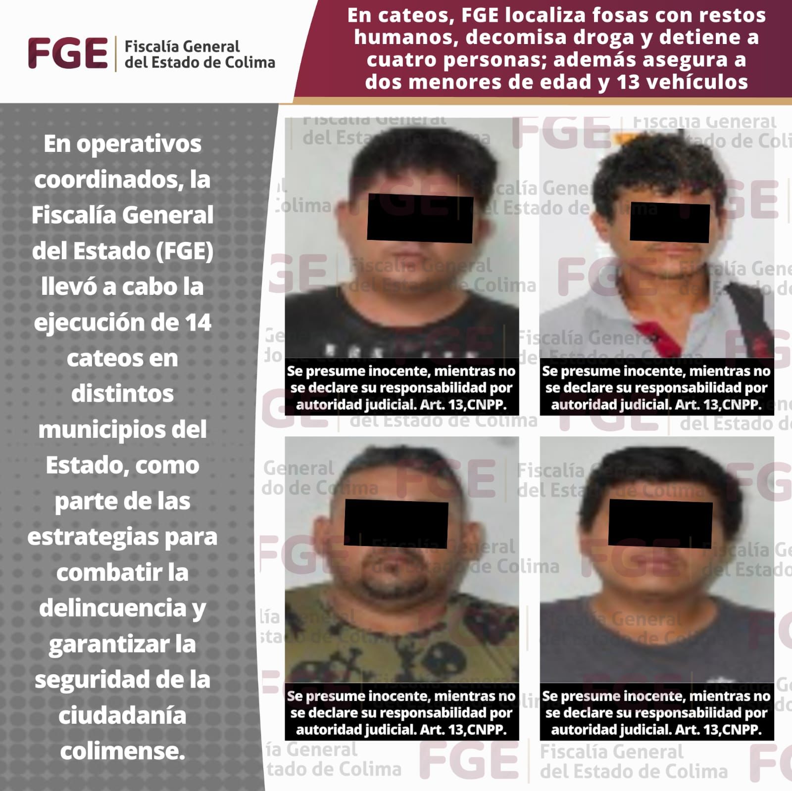 En cateos, FGE localiza fosas con restos humanos, decomisa droga y detiene a cuatro personas; además asegura a dos menores de edad y 13 vehículos