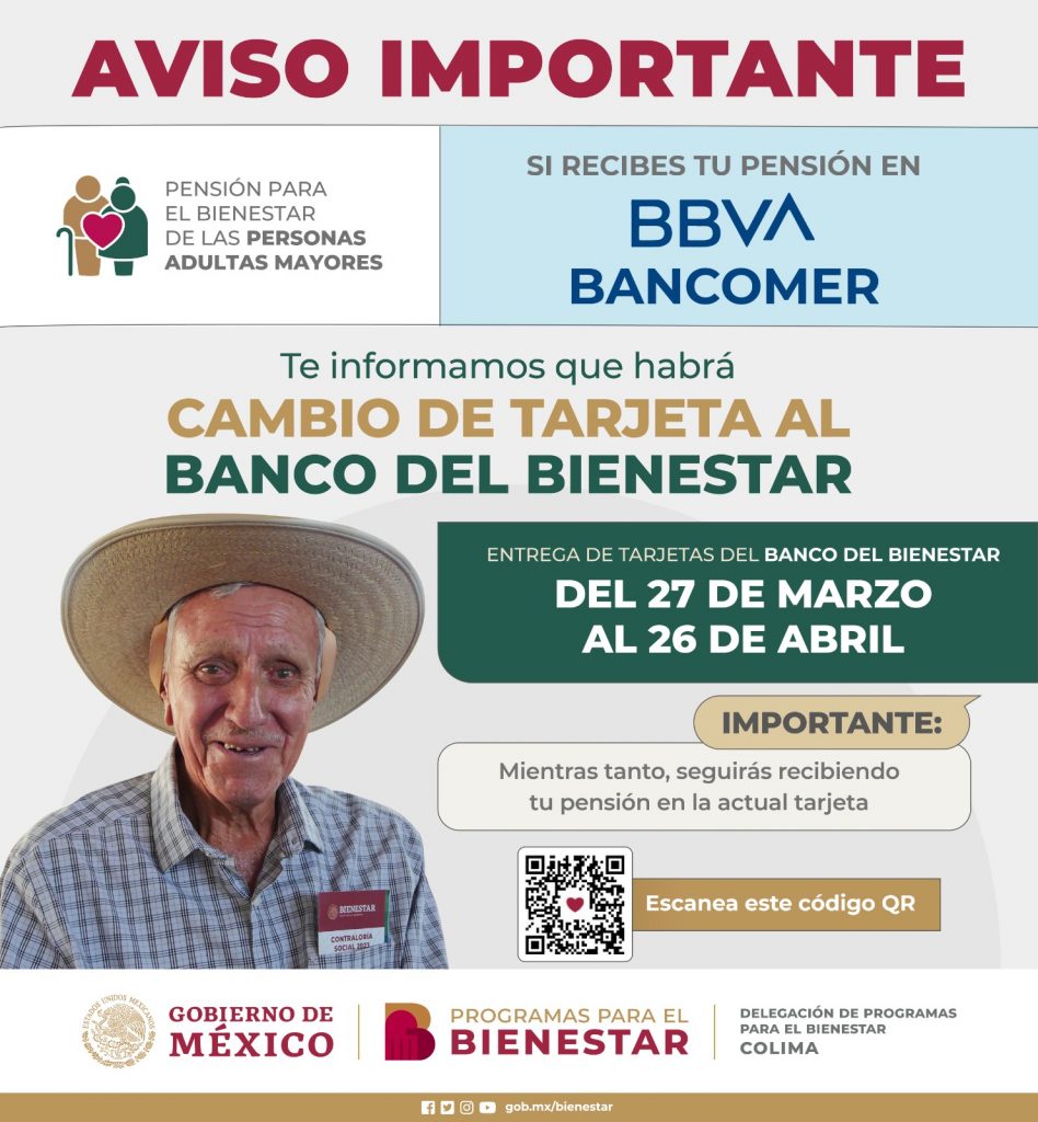 A partir del próximo lunes 27 de marzo y hasta el miércoles 26 de abril, 18 mil 886 colimenses derechohabientes de la Pensión para el Bienestar de las Personas Adultas Mayores que cobran con tarjeta BBVA Bancomer, deberán realizar el cambio a la tarjeta del Banco del Bienestar para continuar recibiendo este derecho, informó la delegada de Programas para el Bienestar en la entidad, Viridiana Valencia Vargas.