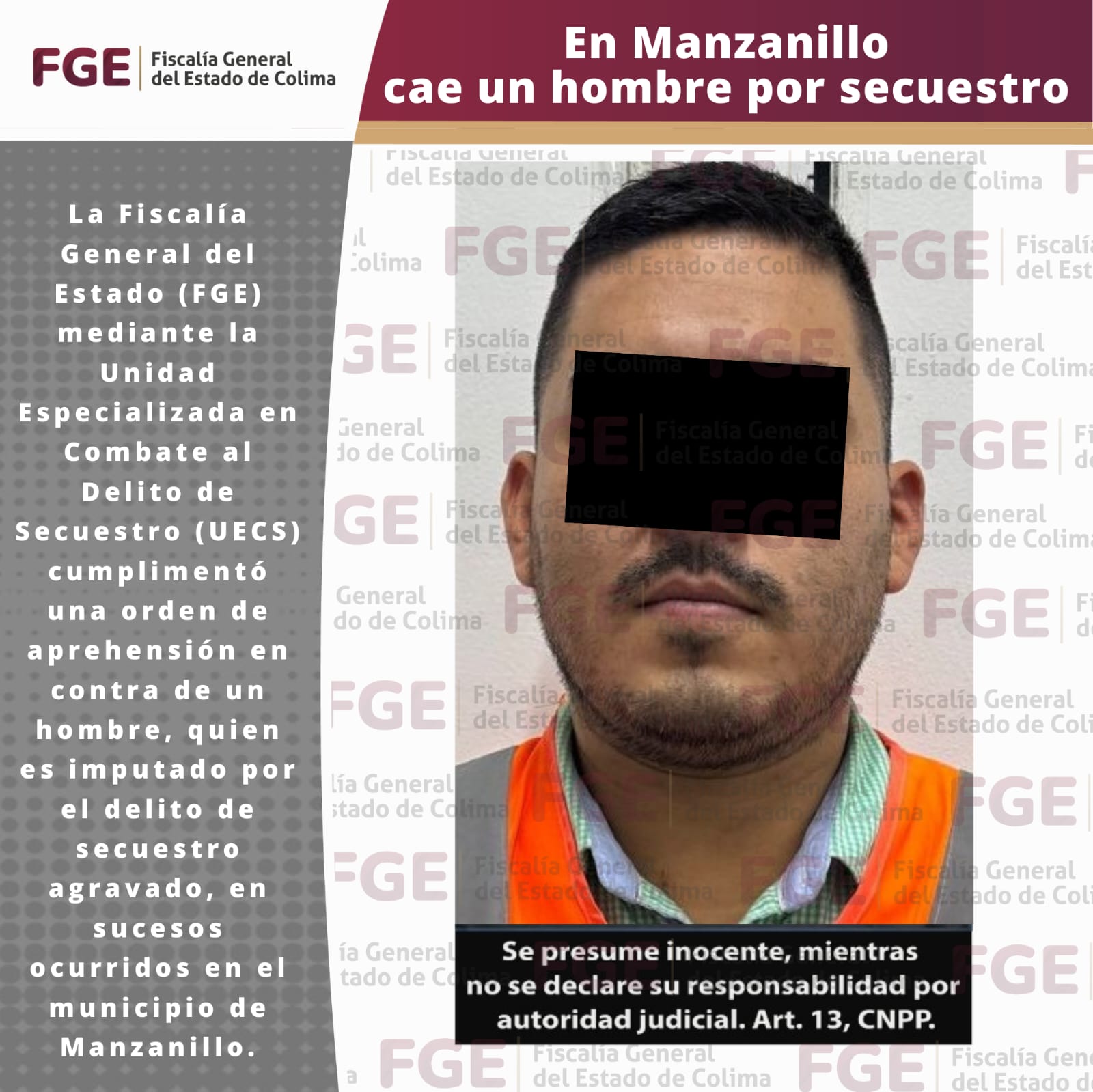 La Fiscalía General del Estado (FGE) mediante la Unidad Especializada en Combate al Delito de Secuestro (UECS) cumplimentó una orden de aprehensión en contra de un hombre, quien es imputado por el delito de secuestro agravado, en sucesos ocurridos en el municipio de Manzanillo.