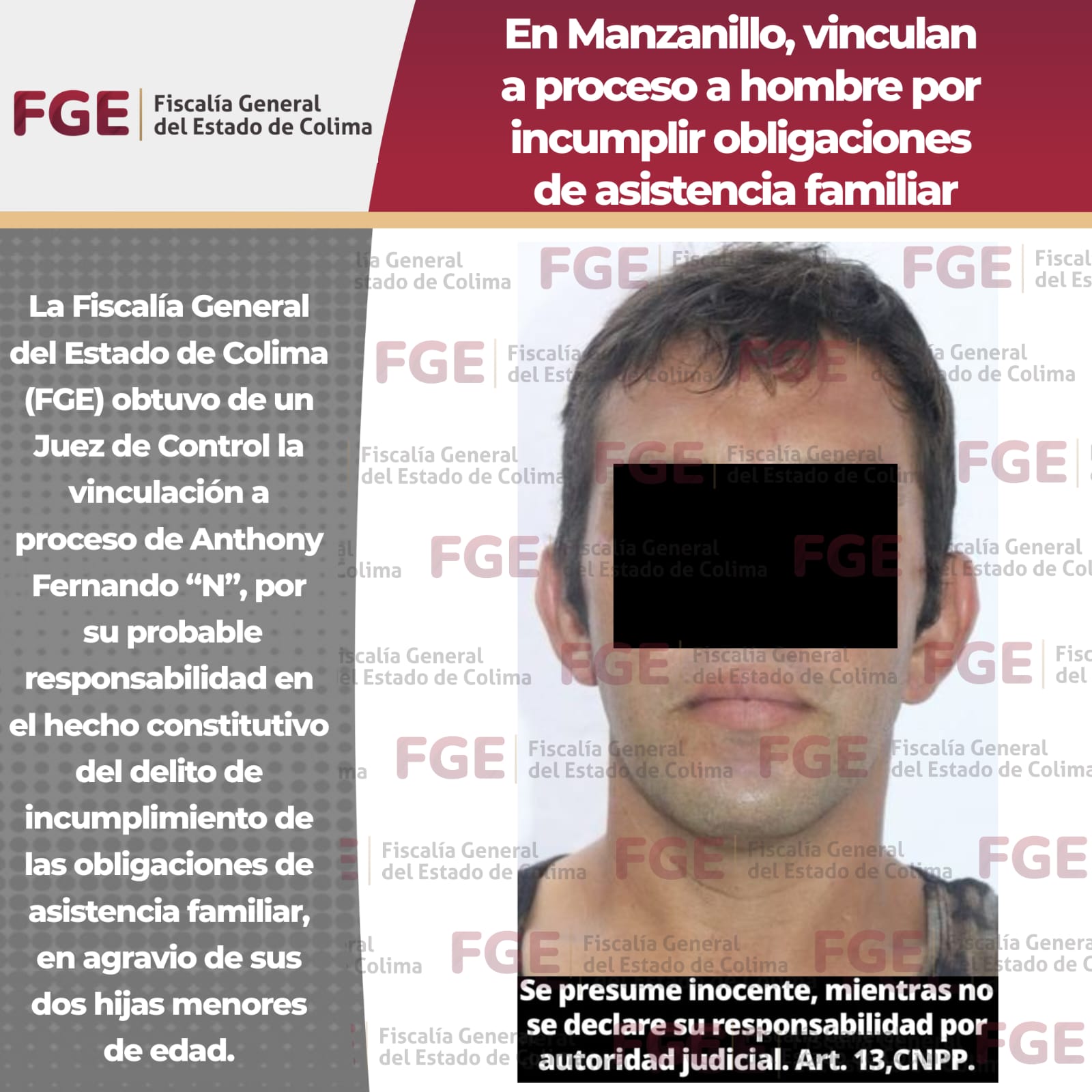 La Fiscalía General del Estado de Colima (FGE) obtuvo de un Juez de Control la vinculación a proceso de Anthony Fernando “N”, por su probable responsabilidad en el hecho constitutivo del delito de incumplimiento de las obligaciones de asistencia familiar, en agravio de sus dos hijas menores de edad.