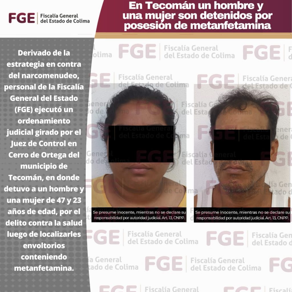 Derivado de la estrategia en contra del narcomenudeo, personal de la Fiscalía General del Estado (FGE) ejecutó un ordenamiento judicial girado por el Juez de Control en Cerro de Ortega del municipio de Tecomán, en donde detuvo a un hombre y una mujer de 47 y 23 años de edad, por el delito contra la salud luego de localizarles envoltorios conteniendo metanfetamina.